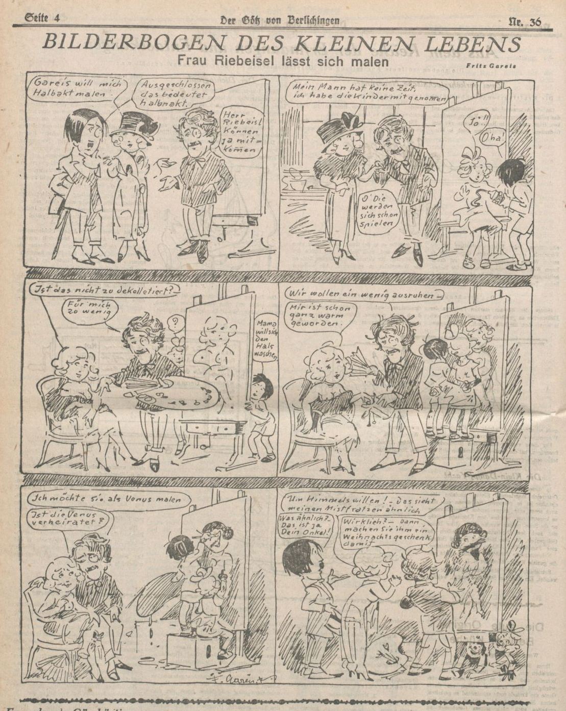 Luckily, there’s a volunteer: it’s the strip’s creator, Fritz Gareis Jr., who draws himself as quite the dandy, monocle and all. (It’s easy to see where Herr Riebeisel gets his clothes-horse tendencies.) Gareis wants to paint Frau Riebeisel halbakt, which, as her husband sourly points out, means halbna[c]kt, or “half-naked.” She’s flattered; Herr Riebeisel is appalled, and declares the proposition out of the question. Gareis, ever the gentleman, suggests that Riebeisel can come along to the sitting.
