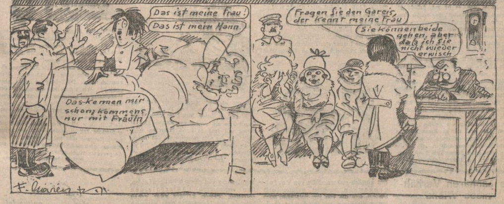 Their night is interrupted, however, by the vice squad. (Note once again, by the way, that Riebeisel apparently sleeps with his monocle in place.) All the times he’s been caught with a young woman, and the one time he’s officially busted, it’s with his wife! “This is my wife!” he says helpfully; “This is my husband!” she affirms. “We’ve heard that before!” replies the inspector; and—because this is Vienna in the 1920s—they arrest her. Not him, of course. In the final panel, he provides a testimonial for her at the police station: “Just ask Gareis, he knows my wife.” Apparently he thinks there’s no better character witness for your wife than a cartoonist who’s seen her naked. No wonder she’s got her head in her hands.