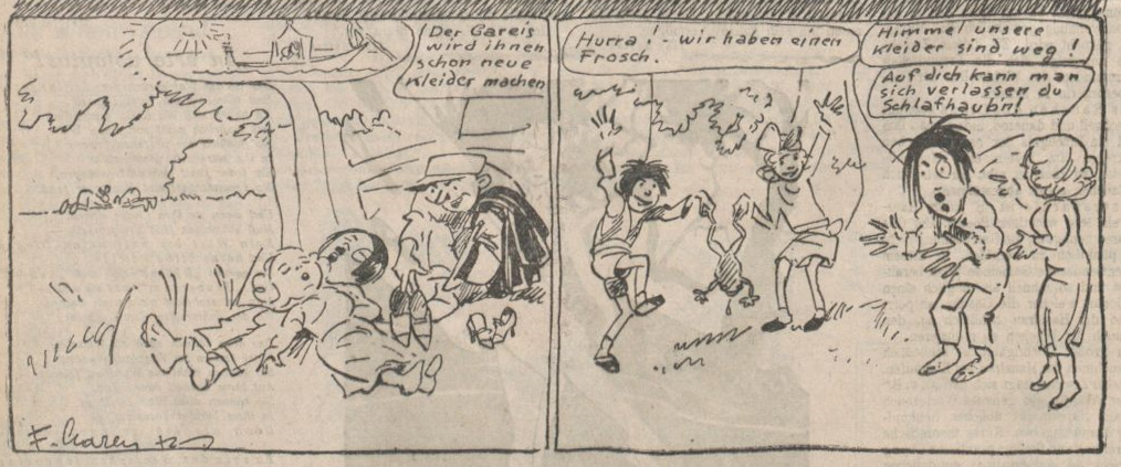 Actually, the way he says “I’ve been a fan of the Riebeisels for a long time now” makes him sound kind of stalkery. Maybe it’s not a good idea to doze off. Herr Riebeisel promises to keep watch, but in the next panel he’s sawing logs in his speech balloon next to his awkwardly foreshortened wife. And then fanboy steals their clothes, which they’ve hung on a tree branch. As far as he’s concerned, it’s a victimless crime: “Gareis will make them new clothes anyway.” Get it? He’ll draw them! Sadly, not until next week’s strip, however, so they’ll have to walk home barefoot and coatless. But at least the kids found a frog! Kids! They redeem everything!